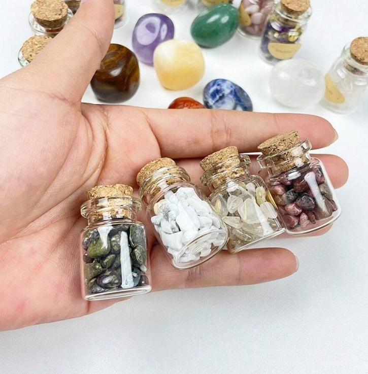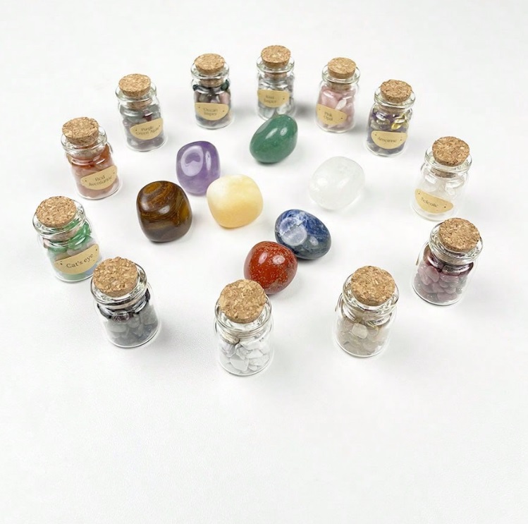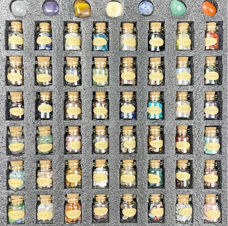 55pc large boxed gemstone set including 48 mini jars of different stones and 7 polished stones. The boxes have a few slight marks but nothing major and has been due to storage which is why they have been reduced in price.