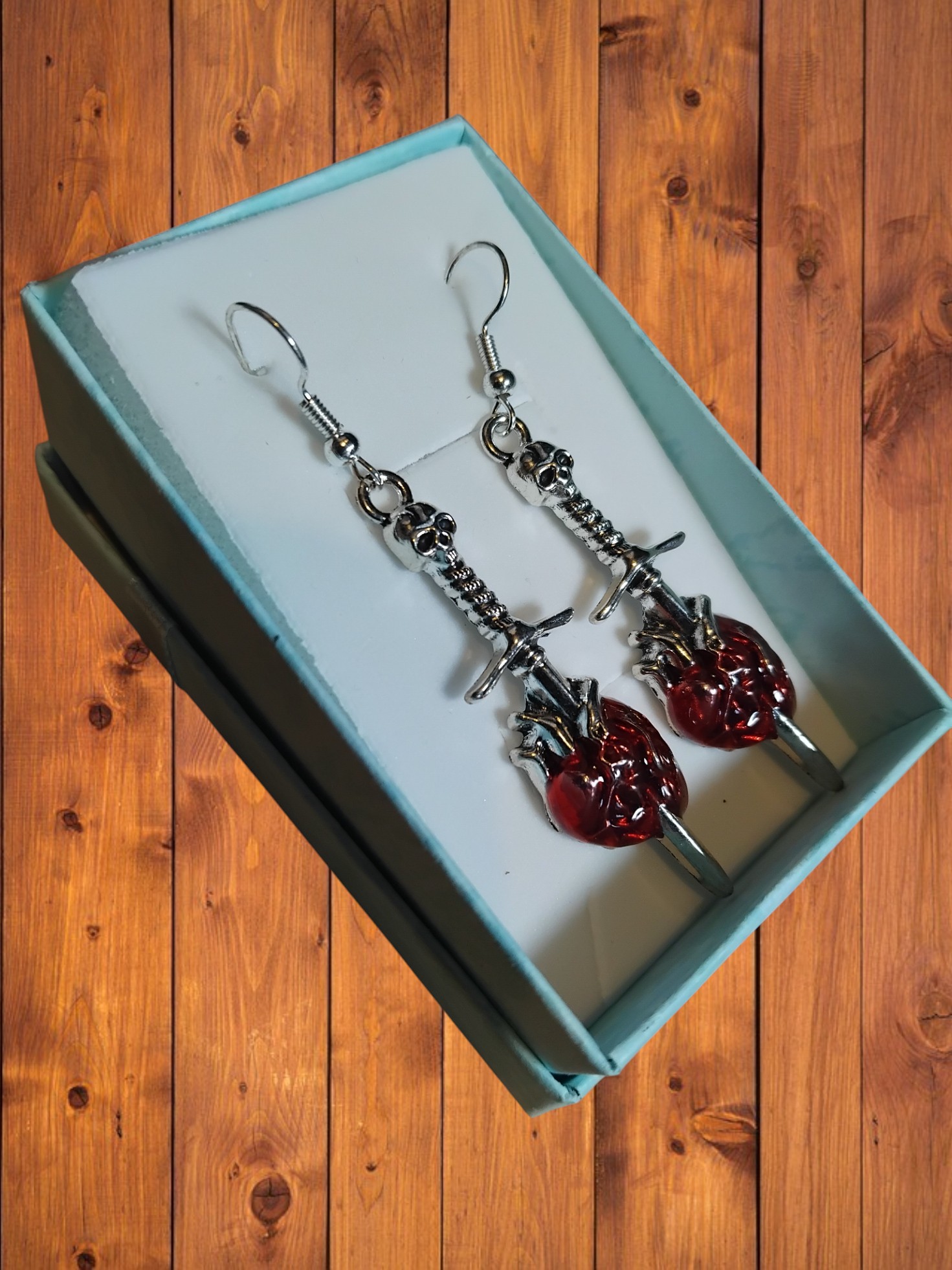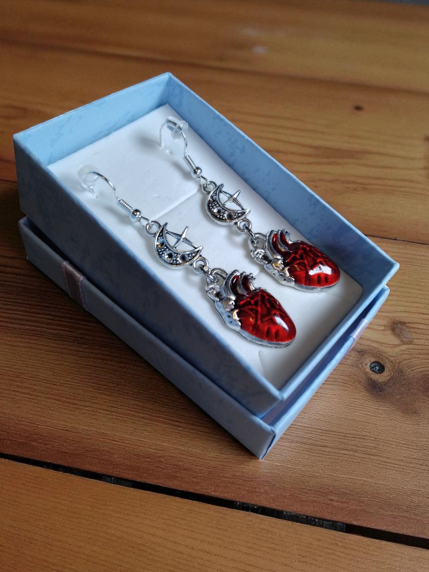 Goth / punk style earrings with moon and clutched blood heart from stone and stainless steel. Boxed and raring to go. The box may be a different colour to that shown.